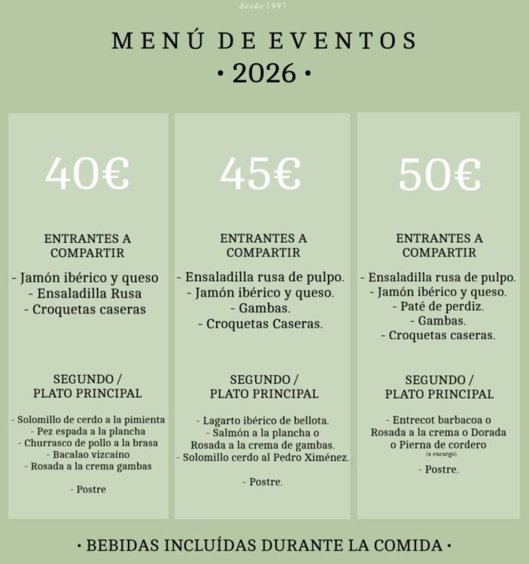 Celebra tu evento con nosotros! Bodas, bautizos, comuniones, cumpleaños y mucho más!. Más información y menús especiales!